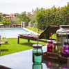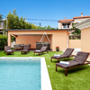 Der Außenbereich umfasst einen weitläufigen Garten mit privatem Pool, Sonnenterrasse und überdachtem Sitzbereich, der ein mediterranes Rückzugsparadies schafft. Das üppige Grün rundherum garantiert absolute Privatsphäre und Ruhe.
