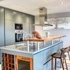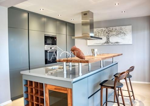 Im Erdgeschoss befindet sich ein großzügiger Open-Space-Wohnbereich mit Küche und Esszimmer, ausgestattet mit luxuriösen Designermöbeln. Die moderne Küche mit Kochinsel und großen Glasfronten bietet einen herrlichen Blick auf die Terrasse und den Pool. Zudem gibt es einen Abstellraum/Garderobe, ein Gäste-WC sowie einen Kaminofen, der dem Raum besondere Wärme und Charme verleiht.