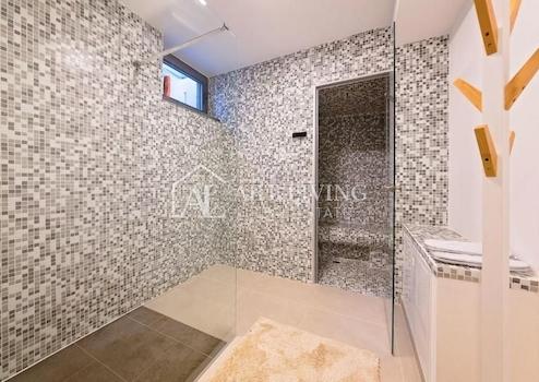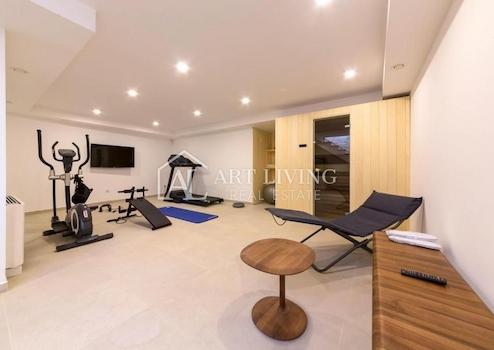 Im Untergeschoss befindet sich ein Wellnessbereich mit Sauna, Dusche und komplett ausgestattetem Fitnessraum, was diese Immobilie zu einem echten Ort der Erholung macht.