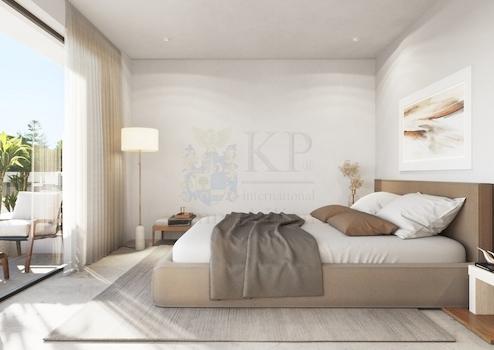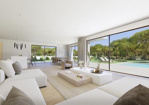 Draußen genießen Sie eine großzügige Terrasse mit Pool sowie einen charmanten Landschaftsgarten mit Bäumen und pflegeleichten Pflanzen. Dank ihrer großen Fenster verbindet die Villa ARIES Eleganz mit natürlicher Harmonie.