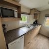 Küche mit viel Stauraum, die sich über einen langen Teil des Chalets erstreckt. Die Küche ist komplett mit Kühlschrank, Gasherd, Dunstabzugshaube und Spüle ausgestattet.