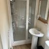 Badezimmer mit Dusche, Waschbecken und Toilette.