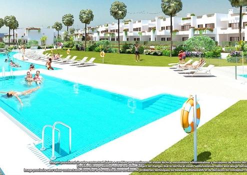Das Neubauobjekt erinnert mit seiner ansprechenden Gestaltung in Weiß an ein andalusisches Dorf. Die Urbanisation bietet umfangreiche Sport- und Freizeit-Einrichtungen mit Pool und vielem mehr sowie diverse Speiselokale, einen Supermarkt. Die Apartments stellen eine ideale Kaufgelegenheit für alle dar, die die Aussicht auf das Mittelmeer, eine einzigartige Lage und resort-ähnliche Gemeinschaftsbereiche zu schätzen wissen. Das Klima ist wie auch im Rest von Andalusien sehr mild. Man kann auch im Winter hier einen schönen Badeurlaub genießen. Wohnungen ab 1 bis 3 Schlafzimmern in mehreren Bauabschnitten - Bsp. Wohnungsangebote 1 Schlafzimmer: EG mit Terrasse/Garten, OG mit Terrasse, DG/Penthouse mit Terrasse plus zusätzliche Dachterrasse. Die angebotene OG-3 Zimmer-Wohnung (2 Schlafzimmer/1 Bad) hat eine bebaute Wohn-Nutz-Fläche von ca. 87 m² inkl. 17 m² Terrasse.