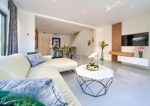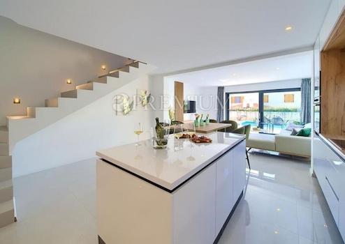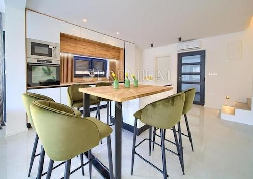 In Malinska steht eine zweistöckige Wohnung mit 99 m² Wohnfläche und 124 m² Garten, mit Pool und Sonnenterrasse, zum Verkauf – ideal für Käufer, die eine Immobilie auf der Insel Krk suchen.
