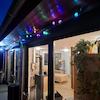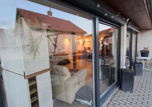 Der Eingang führt uns in das geräumige, 40 m² große Wohnzimmer, in dem sich auch der Essbereich befindet. Die angenehme Wohnatmosphäre wird durch die großen, doppellagigen Fenster und Türen, die für viel Licht sorgen, und den Kamin, der für zusätzliche Gemütlichkeit sorgt, unterstrichen. Dank der großen Fensterfronten lässt sich das Wohnzimmer im Sommer mit einem Handgriff zum Garten hin öffnen. Die gesamten Glasflächen im Wohnzimmer sind mit elektrischen Jalousien ausgestattet, und alle Räume des Hauses verfügen über moderne, energiesparende LED-Beleuchtung.