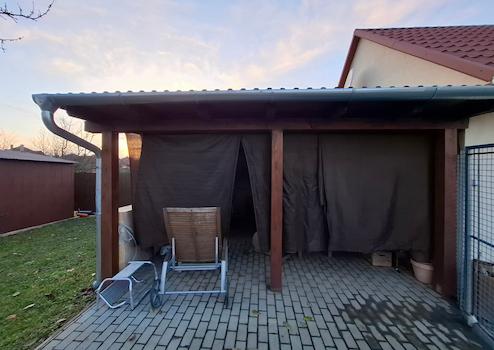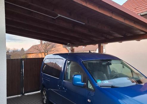 Parkolás tekintetében az utcafronton kapott helyet egy térkövezett fedett kocsibeálló valamint az udvarban egy 20 m²-es lemezgarázs is lehetőséget biztosít az autónk zárt tárolásásra.