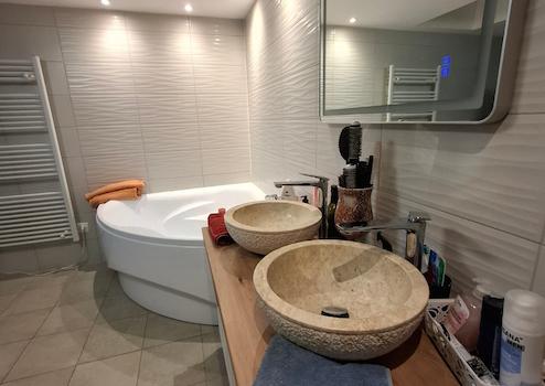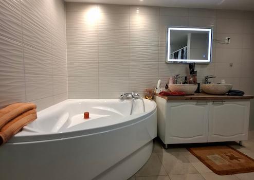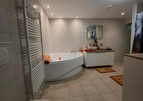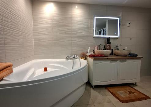 Az ingatlanban továbbá egy hangulatos gépesített konyha kapott helyet, konyhaszigettel együtt. Az ingatlanban három szoba található, melyből az egyik hálószobaként, a másik dolgozószobaként, a harmadik pedig jelenleg plusz szobaként funkcionál. Az exkluzív, nagy méretű fürdőszoba sarokkáddal, külön tágas épített zuhannyal dupla kézmosóval felszerelt. Ebben a nagy fürdőszobában kapott helyet a toalett is.