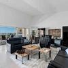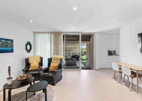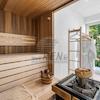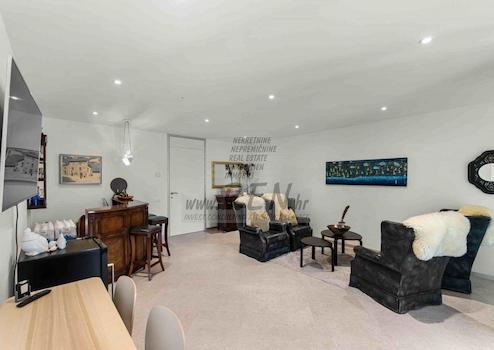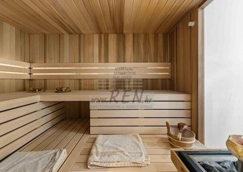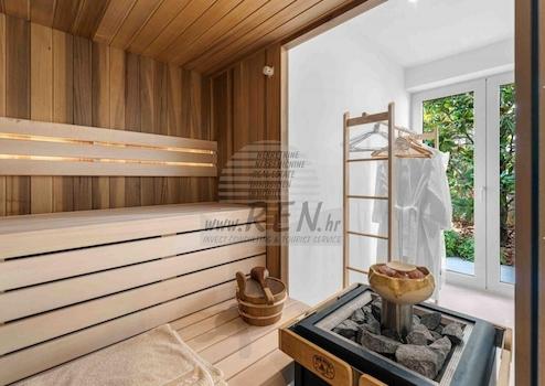 Im Erdgeschoss befinden sich zwei luxuriöse Schlafzimmer, jeweils mit eigenem Bad, eine Garage für drei Autos, eine Waschküche, eine Sauna, ein Wohnbereich sowie eine kleinere Küche.