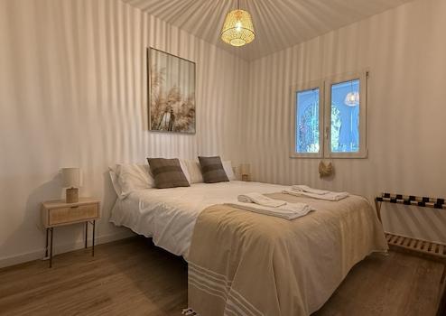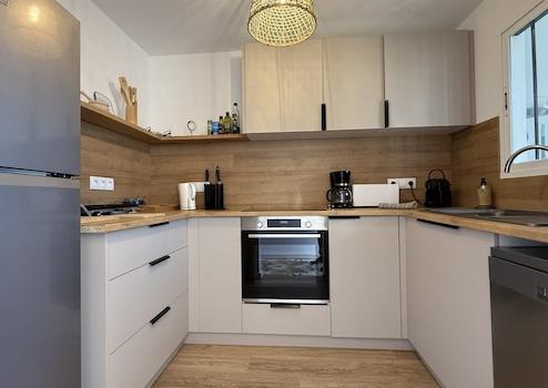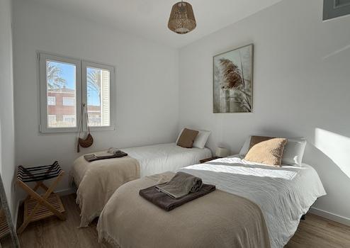 Massivbauweise, Rollläden, Fliegengitter, Fliesenböden, Zentral-Klimaanlage, Deckenventilatoren in beiden Schlafzimmern und auf der Terrasse, 1 Doppelbett 1,8 x 2,0 m, 1 Doppelbett mit zwei Einzelmatratzen 0,90 m x 2,0 m, 1 Doppelbett mit zwei Einzelmatratzen 0,80 m x 2,0 m, 1 Wannenbad, Einbauküche mit Geschirrspüler, Nespresso-Kaffeemaschine, Toaster, usw, WIFI Internet, SAT TV, Einbauschränke, Bügelbrett und Bügeleisen, Fön, Waschmaschine und Trockner großer Gemeinschaftspool von der Terrasse einsehbar, Außendusche, Rasenflächen, Stellplatz für ein PKW Frei auf dem Gemeinschaftsparkplatz u.v.a.m..