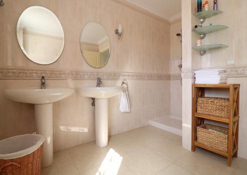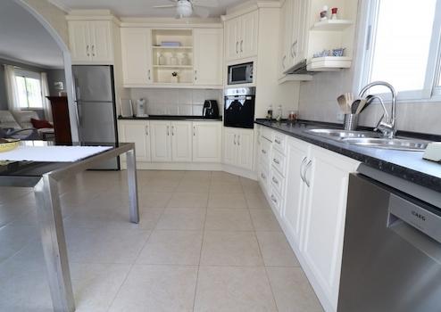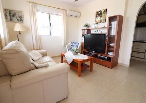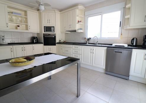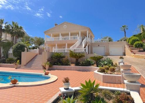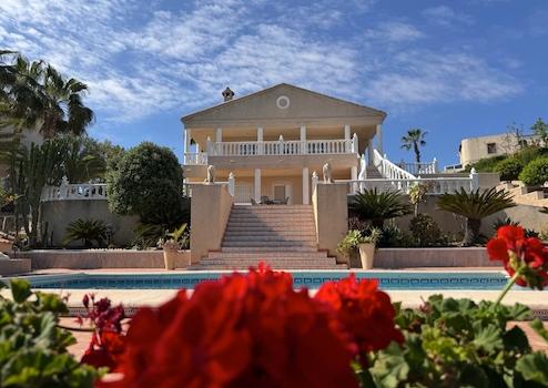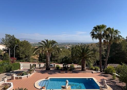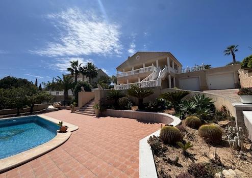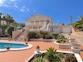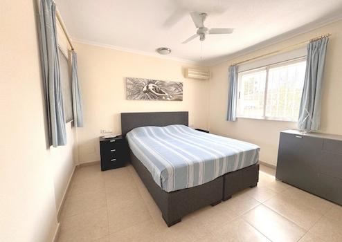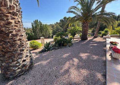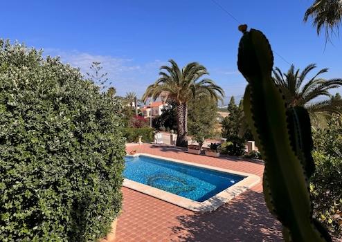 Das Erdgeschoss ist separat zugänglich und verfügt über einen weiteren Wohnbereich, eine Einbauküche, ein Badezimmer sowie zwei geräumige Doppelschlafzimmer. Der Garten ist pflegeleicht mit Kies- und Fliesenflächen gestaltet und bietet eine lange Einfahrt, die zu einer Garage und einem Carport führt. Der Poolbereich besitzt eine geflieste Sonnenterrasse und wird von zahlreichen Palmen, Sträuchern und weiteren mediterranen Pflanzen umrahmt, die für ein besonders privates und ruhiges Ambiente sorgen.