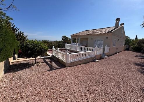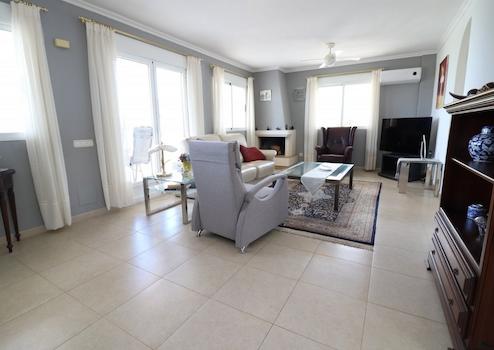 Die Villa steht auf einem großzügigen, 1.220 m² großen, wunderschön angelegten Privatgrundstück und bietet einige der beeindruckendsten offenen Ausblicke der gesamten Umgebung. Der Hauptwohnbereich ist über eine Außentreppe zugänglich, die auf eine L-förmige überdachte Terrasse führt. Von hier aus betritt man den lichtdurchfluteten Wohnraum mit großflächigen Fenstern, Schiebetüren und einem charmanten offenen Kamin. Eine hochwertige, großzügige Wohnküche mit Frühstücksbereich, ein Doppelschlafzimmer sowie ein modernes Familienduschbad komplettieren diese Ebene.