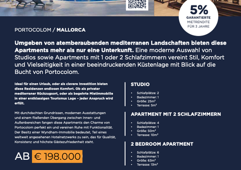 Die moderne Anlage bietet eine exklusive Auswahl an Studios sowie 1- und 2-Schlafzimmer-Apartments. Jede Einheit ist hochwertig ausgestattet, durchdacht geschnitten und überzeugt durch ein helles, klares Raumkonzept – perfekt geeignet für Eigennutzer, Feriengäste oder als renditestarkes Anlageobjekt. Viele Apartments bieten dabei einen fantastischen Blick über die Bucht von Portocolom.