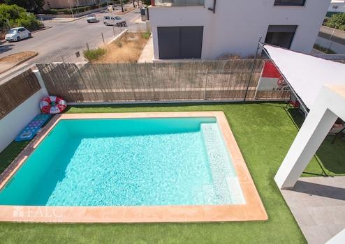 Über das Wohnzimmer und die Küche haben Sie Zugang zum Außenbereich. Die überdachte Terrasse vor der Küche geht nahtlos in den mit Kunstrasen versehenen Garten über. Hier steht Ihnen auch ein eingefasster Pool zur Verfügung, der zum Erfrischen und Planschen einlädt. Dank seiner Klimatisierung können Sie diesen auch während der kühleren Monate problemlos nutzen. Bedienen lässt sich die Beheizung per Fernbedienung.