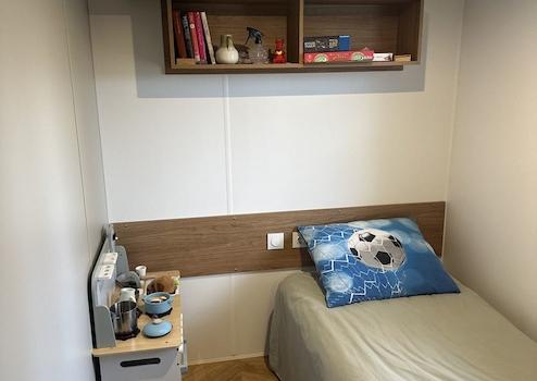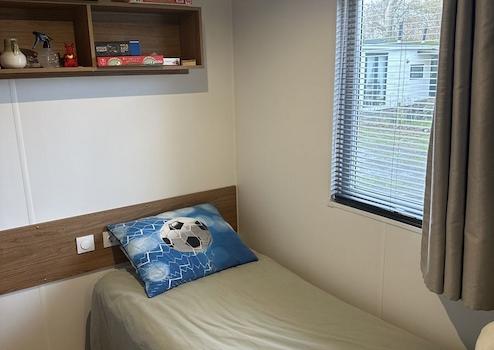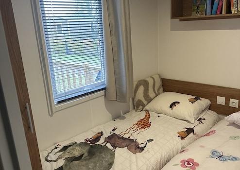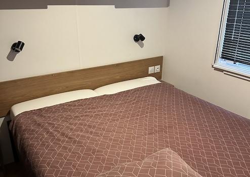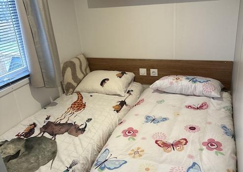 Schlafzimmer 2 bietet zwei komfortable Betten von 0,8 x 2 Metern – ideal für Gäste oder Kinder. Das Fenster ist mit einem hochwertigen Insektenschutz ausgestattet, sodass frische Luft hereinkommt, ohne dass unerwünschte Besucher folgen. Ein praktischer und gemütlicher Raum, der das Chalet noch vielseitiger macht.