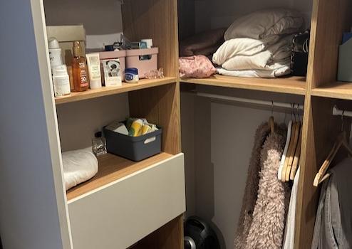 Dieses Schlafzimmer ist clever gestaltet mit zwei Betten, von denen eines ein Ausziehbett ist. So eignet sich der Raum perfekt für mehrere Personen: zusätzliche Schlafmöglichkeiten bei Bedarf und praktische Stauraum-Lösung, wenn das Bett eingeschoben ist. Ein vielseitiger Raum, der Komfort und Funktionalität ideal verbindet.