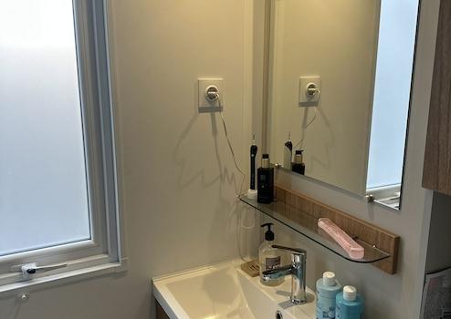 Das Badezimmer des Chalets bietet genau den Komfort und die Ausstattung, die man sich wünscht. Eine großzügige Dusche mit einem kräftigen, leistungsstarken Duschkopf sorgt für einen erfrischenden Start in den Tag oder für entspannende Momente am Abend. Das stilvolle Badmöbel verbindet Funktionalität mit modernem Design und bietet ausreichend Platz für alle wichtigen Utensilien. Alles, was man von einem vollständigen Badezimmer erwartet, ist hier vorhanden – praktisch, gepflegt und sofort bereit zum Genießen.