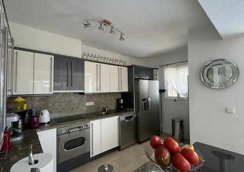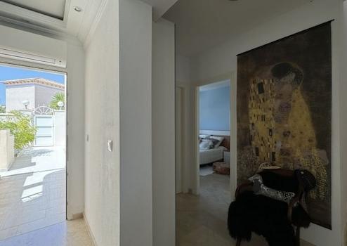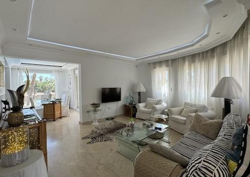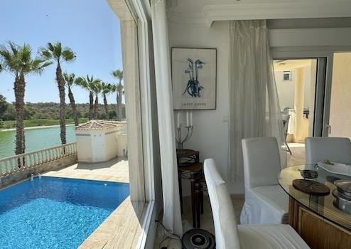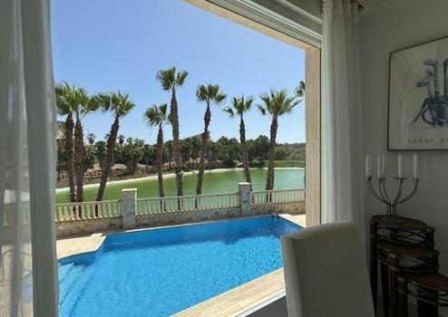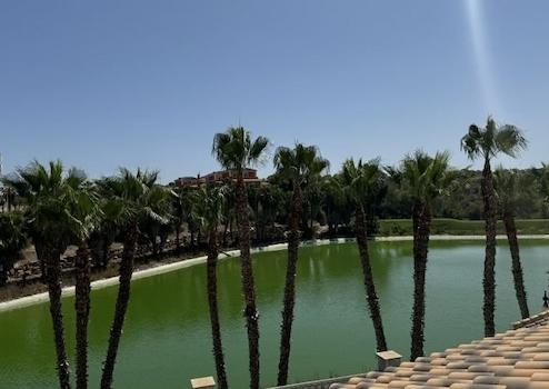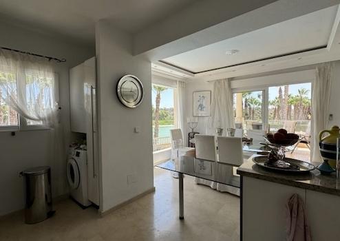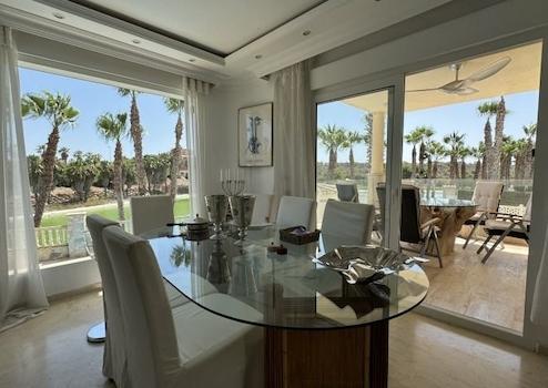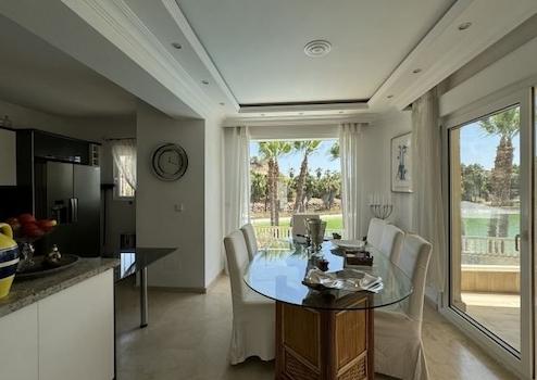 Im Erdgeschoss finden wir zwei Doppelschlafzimmer, zwei Badezimmer, Küche und Wohnzimmer mit großen Fenstern mit unglaublich viel Licht und einem fantastischen Blick auf Palmen, den Teich und den Golfplatz.