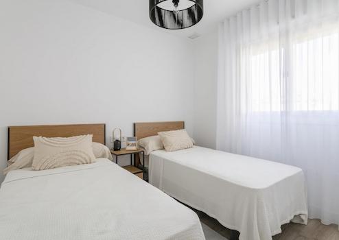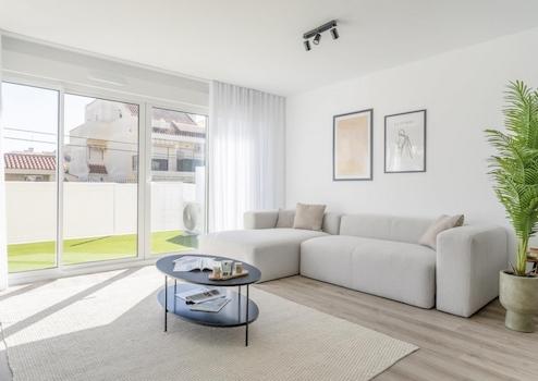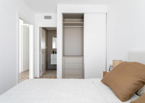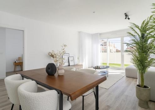 Diese modernen Wohnungen in Gran Alacant vereinen Komfort, Natur und mediterranes Lebensgefühl in idealer Weise. Das Apartment im Erdgeschoss verfügt über einen eigenen Garten sowie drei Schlafzimmer und zwei Badezimmer, ergänzt durch praktische Einbauschränke, die für reichlich Stauraum sorgen. Ein Tiefgaragenstellplatz mit Abstellraum bietet zusätzlichen Komfort und sichere Aufbewahrungsmöglichkeiten. Die Wohnanlage begeistert mit weitläufigen Grünbereichen, einem einladenden Gemeinschaftspool und einem Spielplatz, der besonders für Familien attraktiv ist.