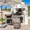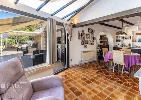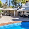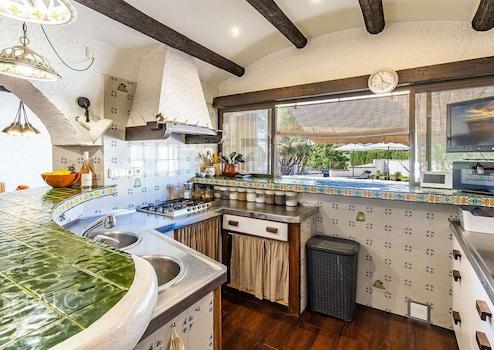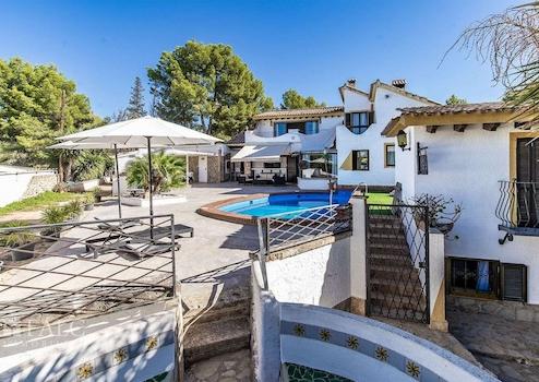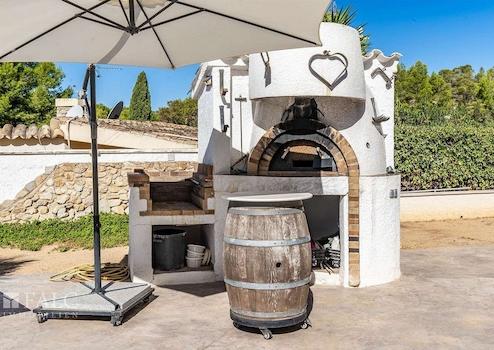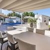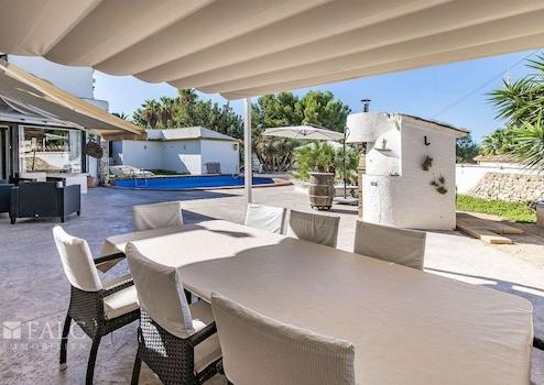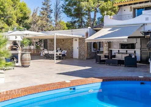 Der Außenbereich ist ideal für mediterranes Wohnen: überdachte und offene Terrassen, ein Swimmingpool mit Lounge-Bereich, ein Garten mit Grillplatz, eine Sommerküche sowie eine gemütliche Chillout-Zone.