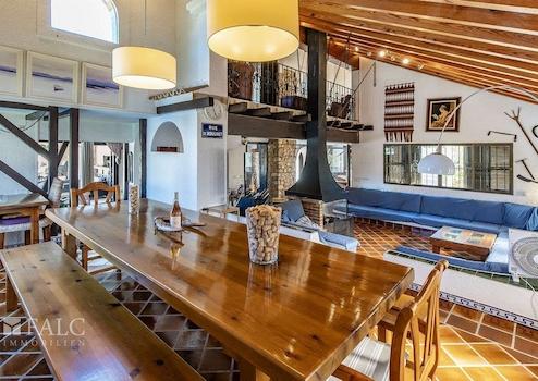 Auf einer bebauten Fläche von ca. 436 m² verteilen sich die Räumlichkeiten großzügig auf zwei Etagen. Im Erdgeschoss befinden sich das helle Wohn-/Esszimmer mit Kamin, hohen Decken und offen gestalteter Galerie sowie eine voll ausgestattete Küche. Vom Wohnbereich aus gelangt man auf eine große Terrasse und zum Pool.