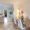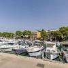 Das Erdgeschoss umfasst den Eingangsbereich, ein Esszimmer, ein Wohnzimmer mit schönem Kamin, eine Gäste-Toilette sowie eine separate Einbauküche mit großen Fenstern und direktem Blick auf den Hafen. Vom Wohnzimmer aus gelangt man auf die private Terrasse von ca. 21 m² sowie über einen weiteren Ausgang direkt in den gepflegten Gemeinschaftsgarten mit erfrischendem Swimmingpool.
