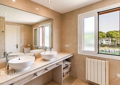 Das obere Stockwerk bietet drei Doppelschlafzimmer mit Einbauschränken – jedes mit exklusivem Meerblick – sowie zwei Badezimmer, eines davon en Suite. Eines der Schlafzimmer verfügt zudem über einen Balkon von ca. 14 m² mit freiem Blick auf den Hafen.