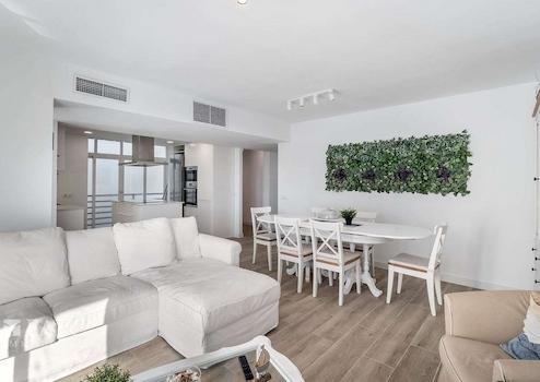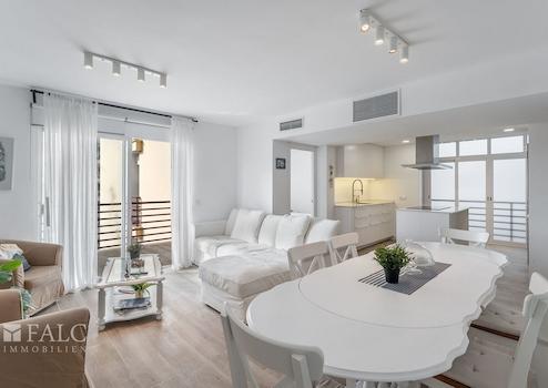 Das lichtdurchflutete Apartment verfügt über eine bebaute Fläche von ca. 110 m² und bietet dank seiner hervorragenden Lage teilweisen Meerblick von der Hauptterrasse. Die schöne Wohnung umfasst ein herrliches Wohn-/Esszimmer, eine moderne, offene Küche im minimalistischen Stil mit einem ca. 6 m² großen Abstellraum, drei geräumige Schlafzimmer mit Einbauschränken sowie zwei Badezimmer, eines davon en suite.