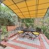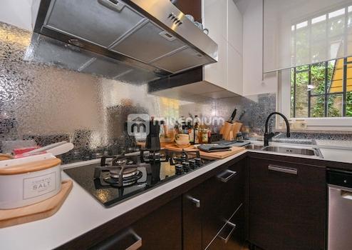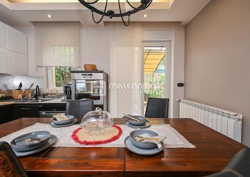 Dank der besonderen Geländekonfiguration befindet sich die Wohnung im 1. Stock. Die Erdgeschosshöhe ist nur seitlich vorhanden. Dort befindet sich eine 12 m² große Terrasse – eine wahre kleine Oase zum Entspannen und Genießen – sowie ein 250 m² großer Garten.