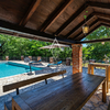 Der Außenbereich bietet eine private Oase mit großem Pool, Whirlpool, gepflegten Gärten mit Lavendel und Rosmarin, überdachter Sommerküche mit Grill sowie einem Spielplatz für Kinder. Zwei überdachte Parkplätze stehen zur Verfügung, mit Möglichkeit zur Erweiterung.