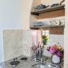 Im Erdgeschoss befinden sich eine Küche und ein Wohnzimmer, im ersten Stock ein Schlafzimmer mit Bad.