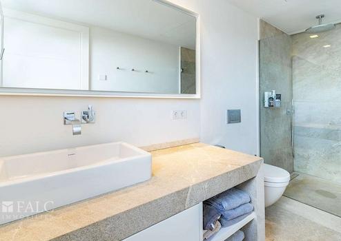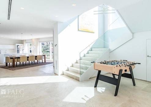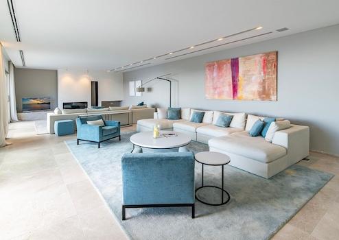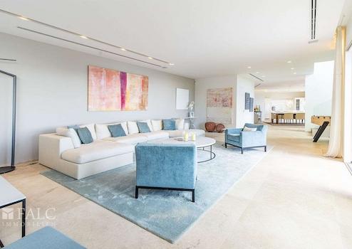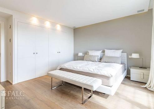 Auf einer bebauten Fläche von ca. 374 m² verteilen sich die Räumlichkeiten auf zwei Etagen. In der oberen Etage befinden sich drei Schlafzimmer, jeweils mit Badezimmer en suite, darunter die Master Suite mit Ankleide und privater Terrasse.