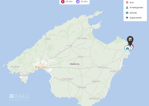 Cala Ratjada (Cala Rajada) gehört zu den beliebtesten Küstenorten im Nordosten Mallorcas. Der Ort bietet mehrere wunderschöne Strände wie Cala Agulla, Son Moll und Cala Gat, einen charmanten Hafen, zahlreiche Restaurants, Cafés, Supermärkte sowie eine gute Auswahl an Freizeit- und Sportmöglichkeiten. Schulen, medizinische Versorgung und alle wichtigen Einrichtungen des täglichen Bedarfs sind gut erreichbar. Die Fahrt vom Flughafen Palma dauert je nach Verkehr etwa 60–70 Minuten.