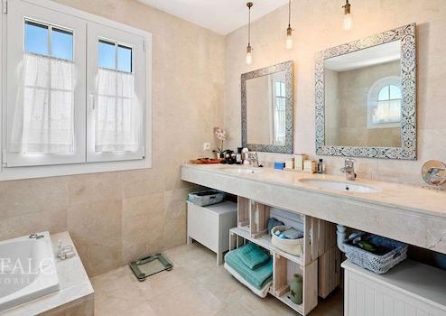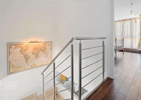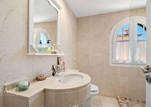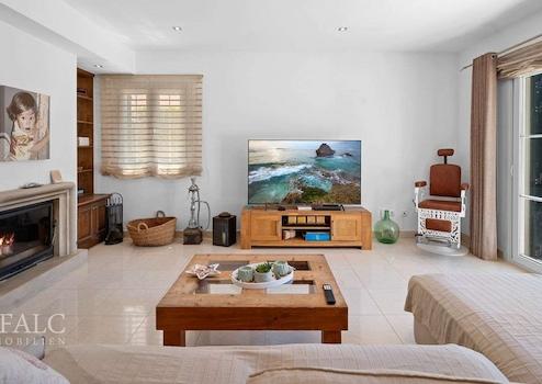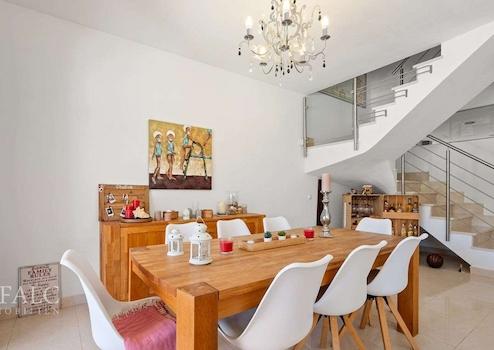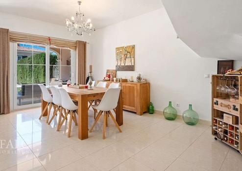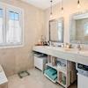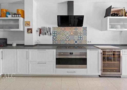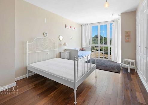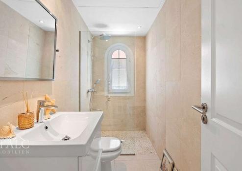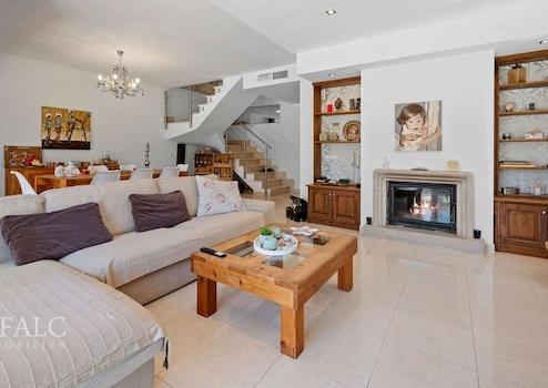 Im Erdgeschoss befinden sich eine separate, voll ausgestattete Küche, ein lichtdurchfluteter Wohn-/Essbereich mit Kamin und direktem Zugang zur schönen Außenterrasse, ein Badezimmer sowie eine Waschküche. Im ersten Stock stehen drei großzügige Schlafzimmer mit Einbauschränken und zwei Badezimmer – eines davon en suite – zur Verfügung. Das Hauptschlafzimmer bietet zudem eine Ankleide sowie eine private Terrasse mit herrlichem Blick auf die umliegende Landschaft.