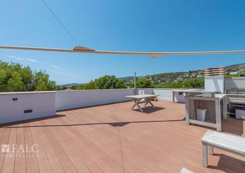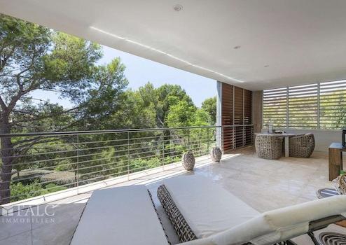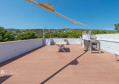 Vom Wohnzimmer und Hauptschlafzimmer gelangt man auf die ca. 40 m² große Terrasse mit Blick auf den Gemeinschaftspool. Über eine interne Treppe erreicht man die private Dachterrasse von ca. 70 m² mit herrlichem Blick über den Golfplatz des Real Golf de Bendinat.