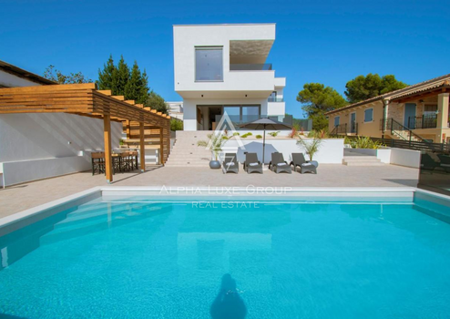 Der Außenbereich ist sorgfältig gestaltet und luxuriös ausgestattet, mit einem 8×6 m großen Pool, einer Sommerküche mit Grill, einem Essbereich im Freien, einer überdachten Lounge und einer Außendusche. Dekorative Beleuchtung sorgt abends für zusätzliche Ästhetik und Sicherheit.