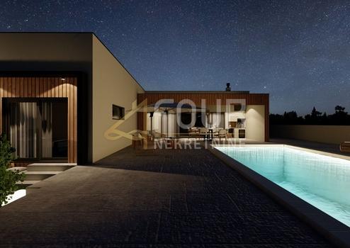 In einem ruhigen istrischen Ort in der Nähe von Svetvinčenat wird ein modernes Erdgeschoss mit Pool und herrlichem Meerblick verkauft. Das Haus wurde als hochwertiger Neubau konzipiert, dessen Fertigstellung für 2025/2026 erwartet wird, und derzeit sind etwa 70% der Arbeiten abgeschlossen und es wird im aktuellen Zustand verkauft. Es erstreckt sich über 180 m2 und befindet sich auf einem 813 m2 großen Grundstück mit einem angelegten Garten von 633 m2. Das Innere ist als geräumiges und funktionales Zuhause mit vier Schlafzimmern, jeweils mit eigenem Bad, großem Wohnzimmer und Küche mit Zugang zur überdachten Terrasse konzipiert. Fußbodenheizung und Aluminiumfenster sind geplant, und der gesamte Außenbereich ist so gestaltet, dass Privatsphäre und Genuss garantiert sind. Neben dem Pool befinden sich eine Außenküche, eine Außendusche und ein Bereich für einen Spielplatz für Kinder. Zwei überdachte Parkplätze sind ebenfalls vorhanden. Die Immobilie eignet sich ideal als zukünftiges Familienheim, Ferienhaus oder Investition.