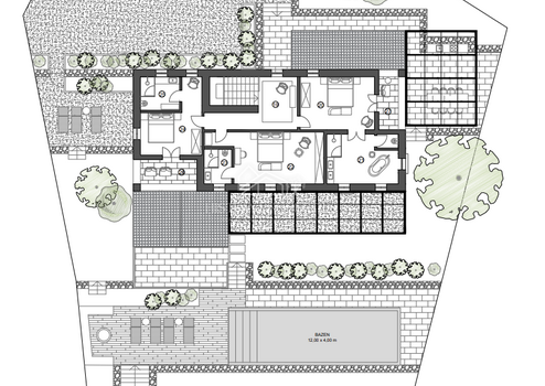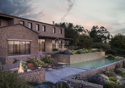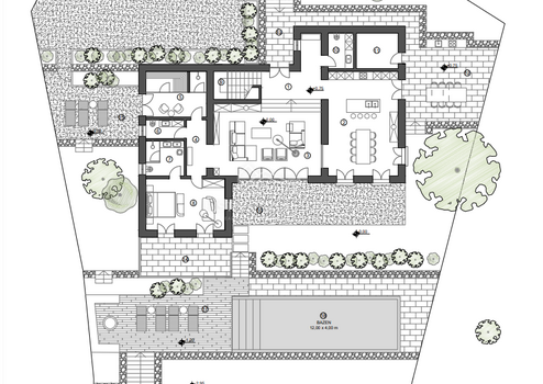 Die Villa verfügt über einen offenen Wohnbereich mit moderner Küche, Esszimmer und einem Wohnzimmer, dessen Wände mit großen Steinen verglast sind und das Innere der Villa mit den Annehmlichkeiten im Freien verbindet. Dazu gehören ein in die wunderschöne Landschaft eingebetteter Swimmingpool, eine einladende Sonnenterrasse, eine Sommerküche und ein liebevoll gestalteter Innenhof. Ein zusätzlicher Entspannungsbereich mit Wellnessbereich (Sauna, Whirlpool und Dusche) und eigenem Wohnbereich im Freien rundet das Angebot ab.