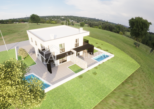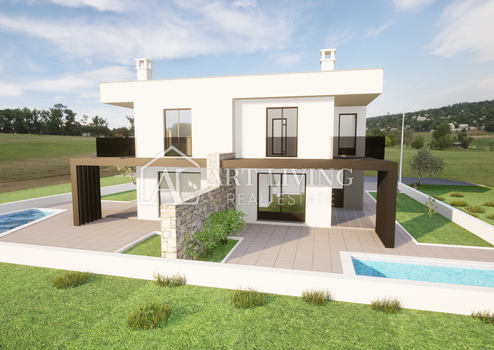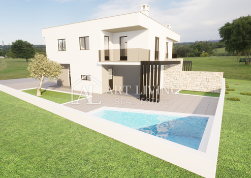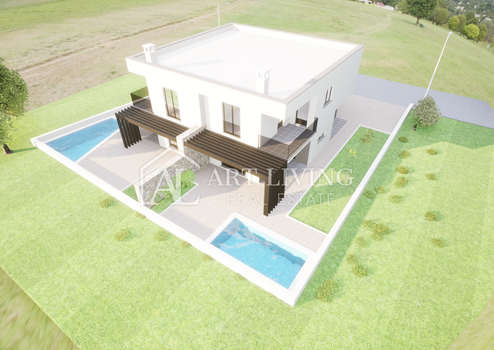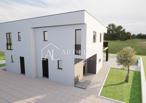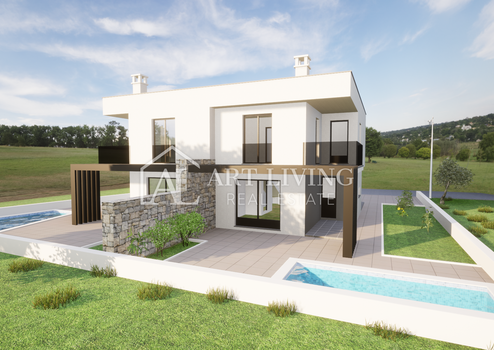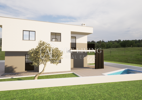 Eine Doppelhaushälfte mit Pool in einem modernen Neubau steht zum Verkauf. Die Villa liegt 3.500 m vom Zentrum von Umag und dem Meer entfernt und bietet einen herrlichen Blick auf die Umgebung und die Landschaft.