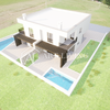 Vor dem Haus befindet sich ein Pool mit Pergola.