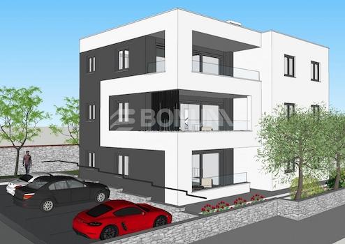 An einer der begehrtesten Mikrolagen in Vodice (Srima), nur 30 m vom Meer und einem gepflegten Strand entfernt, entsteht ein Luxusgebäude mit drei Etagen nach dem Konzept „eine Wohnung pro Etage“, wodurch zusätzliche Privatsphäre und Komfort gewährleistet werden. Jede Wohnung bietet einen offenen Panoramablick auf das Meer und die Inseln; vorgesehen sind moderne Wohnstandards: erstklassige Keramik, Außenschreinerei mit Dreifachverglasung, elektrische Rollladensteuerung und Insektenschutzgitter, Glasgeländer, Fußbodenheizung, Klimaanlage in allen Räumen sowie moderne Sanitärausstattung. Die Wohnung im zweiten Stock hat eine Netto-Nutzfläche von 109,59 m² und verfügt über zwei Stellplätze. Sie besteht aus Eingangsbereich, Küche mit Abstellraum, Essbereich, einem großzügigen Wohnzimmer mit 37,75 m² und Zugang zu einer überdachten Loggia von 15,40 m², zwei Schlafzimmern, einem Badezimmer, einem separaten WC sowie zwei weiteren überdachten Loggien.