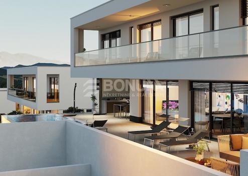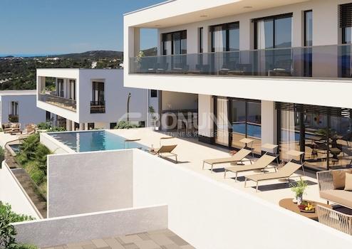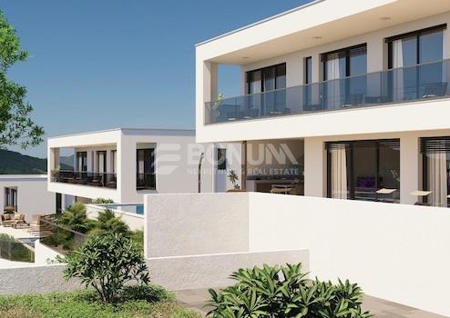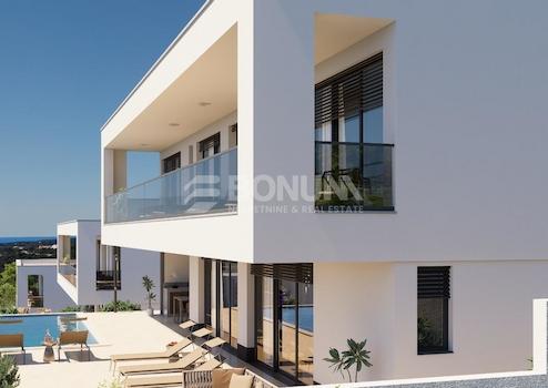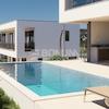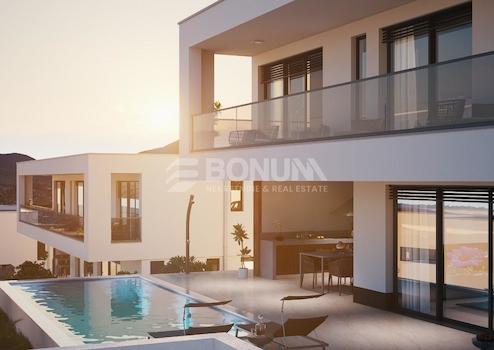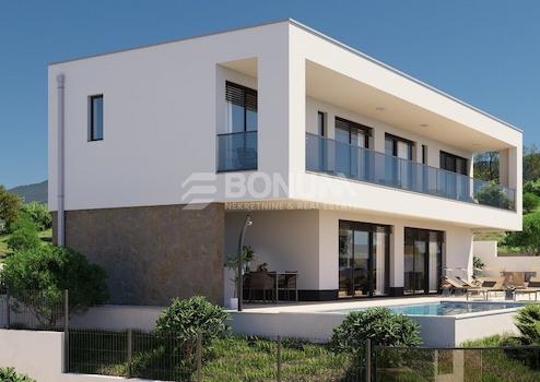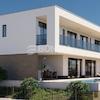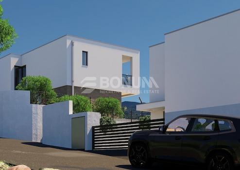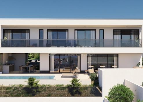 Im Untergeschoss ist ein großer Freizeit-/Konobabereich mit Vorraum und Treppe vorgesehen, wodurch die Villa auch für die ganzjährige Nutzung geeignet ist. Der Außenbereich ist mit einer privaten Pool- und Sonnenzone geplant. Auf dem Grundstück sind zwei Stellplätze vorhanden, zudem gibt es eine organisierte Zufahrt (Haupteingang für Fußgänger und Fahrzeuge sowie einen zusätzlichen Fußgängereingang).