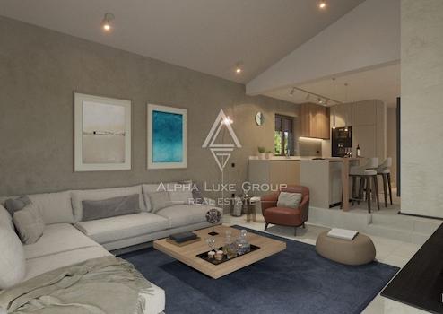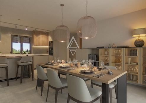 Das Erdgeschoss ist als offener Wohnbereich konzipiert und umfasst ein großzügiges Wohnzimmer mit direkter Verbindung zur Küche und zum Essbereich sowie Zugang zur Terrasse. Auf dieser Ebene befinden sich zudem ein Schlafzimmer mit eigenem Bad, ein Gäste WC und ein praktischer Abstellraum. Im Obergeschoss liegen zwei weitere Schlafzimmer, jeweils mit eigenem Badezimmer, sowie der Zugang zu einer gemeinschaftlichen Terrasse.