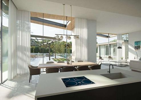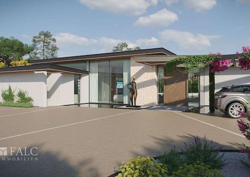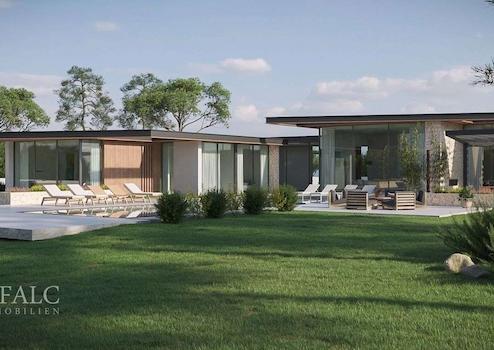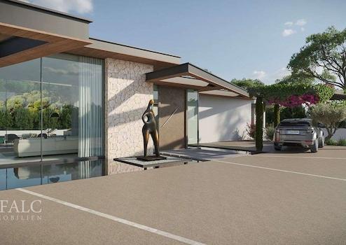 Die exklusive Villa, ein architektonisches Meisterwerk, bietet auf der Hauptebene ein helles und geräumiges, offenes Wohn-/Esszimmer mit Kamin und Zugang zum Außenbereich, eine moderne Küche, 4 Schlafzimmer und 4 Bäder en suite. Die untere Ebene lässt keine Wünsche offen und umfasst einen Fitnessbereich sowie eine Garage für 3 Fahrzeuge.