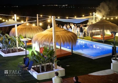 Es verfügt über zwei charmante Wohnzimmer mit angrenzenden Essbereichen, große Fensterfronten und direkten Zugang zur weitläufigen Terrasse mit ca. 150 m². Zudem stehen zwei moderne Einbauküchen, insgesamt acht Schlafzimmer, vier Bäder – davon zwei en suite – sowie zwei Gästetoiletten zur Verfügung.