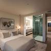 Beeindruckende Master-Suite mit Ankleidebereich, Büroraum, verglaster Dusche, Doppelwaschbecken und direktem Zugang zur Terrasse mit Blick auf den Golfplatz