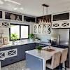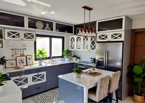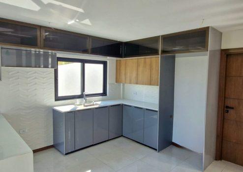 Einbauküche: Ausgestattet mit Ober- und Unterschränken, Arbeitsplatten und Frühstücksbar aus Quarz.