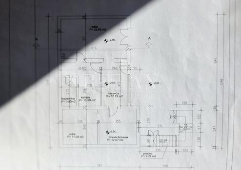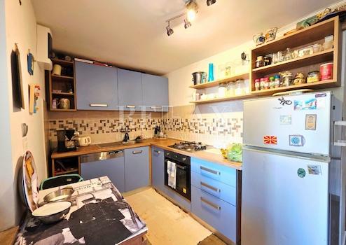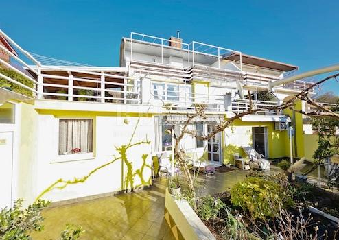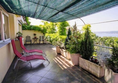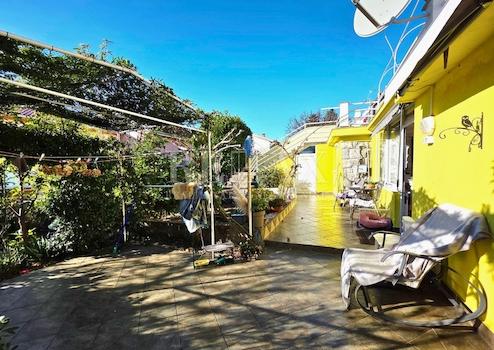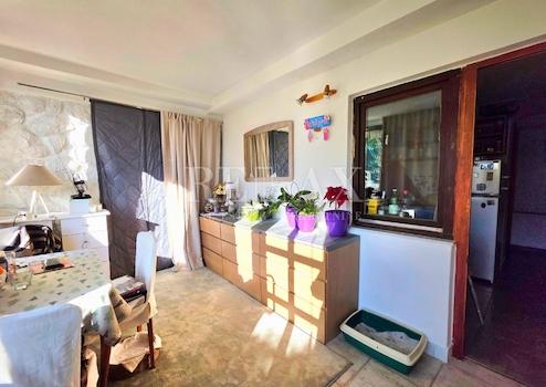 Im Erdgeschoss befindet sich eine Wohnung mit einer Fläche von 112,98 m², bestehend aus einer geschlossenen Eingangsveranda, zwei großen Schlafzimmern, einem geräumigen Badezimmer und einem offenen Wohnbereich mit Küche und Wohnzimmer sowie Zugang zu einer Terrasse mit Meerblick. Vor der Wohnung befinden sich zwei Terrassen – eine überdacht mit einer Pergola, die andere offen mit Panoramablick auf das Meer. Auf dem Grundstück befindet sich zudem ein Nebengebäude mit einer Fläche von 9 m². Die Wohnung ist klimatisiert, und die Beheizung erfolgt zentral über einen Pelletofen, der beide Wohneinheiten über Radiatoren versorgt.