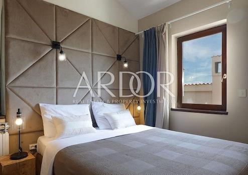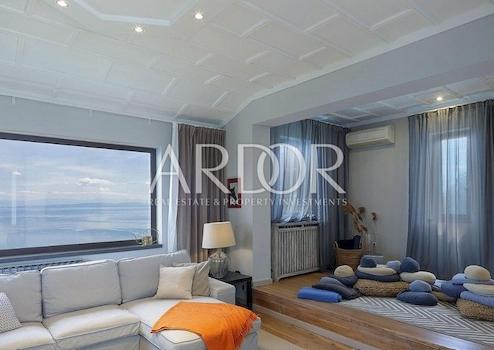 Das schöne Hauptwohnzimmer ist mit dem geräumigen Esszimmer und der Küche verbunden. Der gesamte Raum bietet einen unverbauten Blick auf die Kvarner Bucht. Vom Esszimmer aus gelangt man auf einen bezaubernden Balkon mit atemberaubender Aussicht. Von der wunderschön eingerichteten und voll ausgestatteten Küche gelangt man auf die Terrasse mit Pool. Darüber hinaus gibt es ein weiteres Wohnzimmer mit Küche und Esszimmer, das für Funktionalität und Komfort im Alltag sorgt.