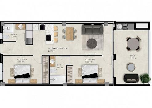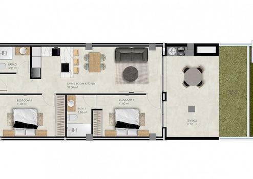 Diese zeitgemäßen Immobilien verfügen über zwei Schlafzimmer, zwei Badezimmer, eine moderne Küche und einen offenen Wohn-/Essbereich. Die Apartments im Erdgeschoss verfügen über einen privaten Garten, die Immobilien im ersten Stock über eine große Terrasse und die Penthouse-Apartments über ein privates Solarium. Alle Einheiten wurden mit modernen Linien, funktionalen Grundrissen und viel natürlichem Licht gestaltet.