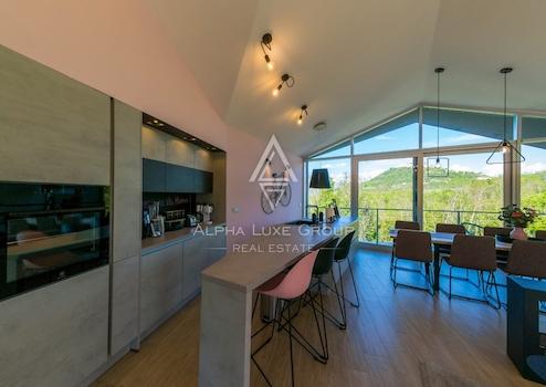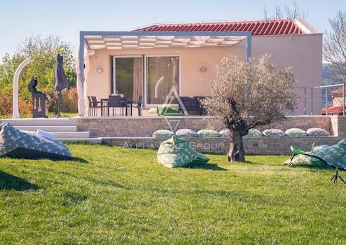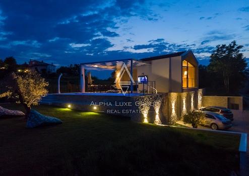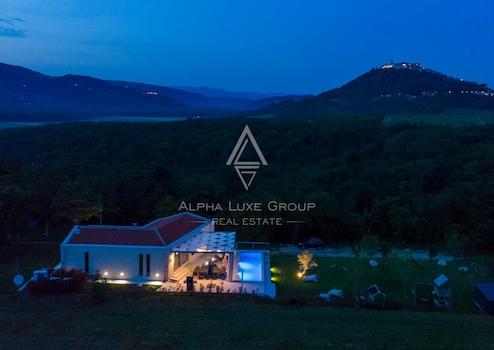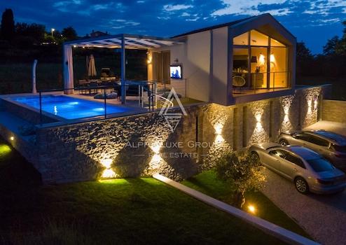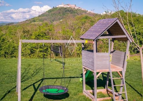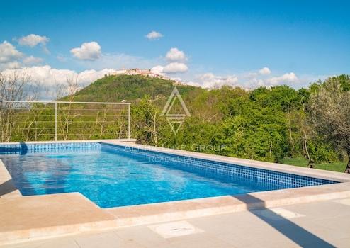 In außergewöhnlich ruhiger Lage befindet sich eine besondere Villa mit modernem Konzept, die sich durch ihren unkonventionellen Grundriss und den weiten Blick über Motovun und die umliegende Landschaft auszeichnet.